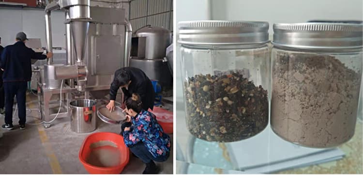 代餐粉的營養(yǎng)價(jià)值各不相同,添加不同的原料會(huì)產(chǎn)生不同的保健功能。今天我們會(huì)介紹一種營養(yǎng)價(jià)值非常高的代餐粉,它是由黑豆,小赤豆,薏仁,黑米,花生,核桃,干棗片,枸杞,芝麻等五谷雜糧及人參等一些名貴中藥材按照一定的營養(yǎng)配比混合而成,成分高達(dá)40多種。這款物料中含油性及粘性物料給五谷代餐粉的生產(chǎn)加工帶來了一定的難度。并且它的粉末細(xì)度要求80-100目,油性及粘性的物料在粉碎過程容易堵塞粉碎機(jī)腔,以往普通的超微粉碎機(jī)很難粉碎到這個(gè)細(xì)度??蛻魩Я蟻砉S試機(jī),技術(shù)人員對(duì)機(jī)腔進(jìn)行一定的整改,代餐粉的粉碎加工順利完成。在沒有使用液氮冷凍粉碎機(jī)的情況下,能夠達(dá)到這樣的細(xì)度和產(chǎn)量,已經(jīng)非常成功了。