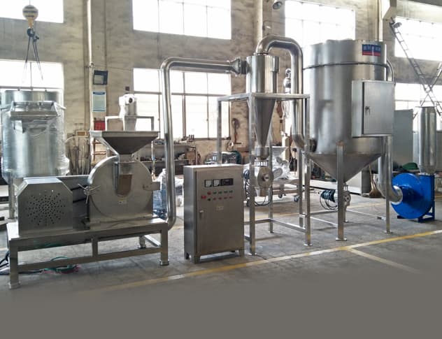 機器高速運轉(zhuǎn)下活動刀盤與固定齒圈發(fā)生撞擊摩擦,物料通過與刀具之間的切割撞擊摩擦獲得粉碎。粒度大小可通過更換篩網(wǎng)獲得。需要產(chǎn)量高可選用此配置,此配置含粉碎主機,除塵箱,高壓風(fēng)機,旋風(fēng)出料,電箱。粉碎好的物料經(jīng)旋風(fēng)分離從出料口流出。粉塵在高壓風(fēng)機的作用下,進(jìn)入除塵箱,過濾回收再利用。