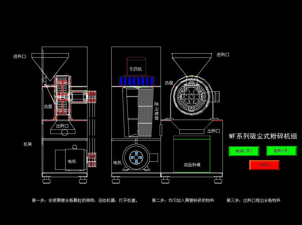 機器高速運轉(zhuǎn)下活動刀盤與固定齒圈發(fā)生撞擊摩擦,物料通過與刀具之間的切割撞擊摩擦獲得粉碎。粒度大小可通過更換篩網(wǎng)獲得。產(chǎn)量要求不高可選用此配置,此配置含旋風出料和布袋除塵。粉碎好的物料經(jīng)旋風分離從出料口流出。粉塵在吸塵電機作用下進入布袋除塵,過濾回收再利用。刀具可根據(jù)不同物料更換不同刀具。